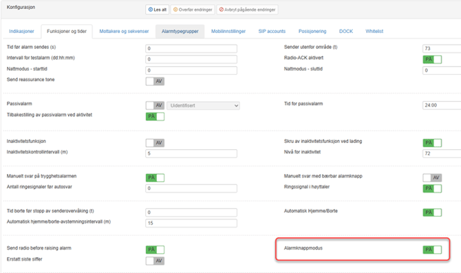 For aktivering av «Alarmknappmodus», velg Konfigurasjon og Indikasjoner på aktuelle NOVO Go enhet. Sett «Alarmknappmodus til PÅ, deretter trykk Overføring endringer. «Alarmknappmodus» vil bli aktivert på NOVO Go enheten.