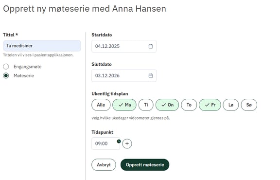 Møteserier vises med ukedager og start-/sluttdato for perioden.