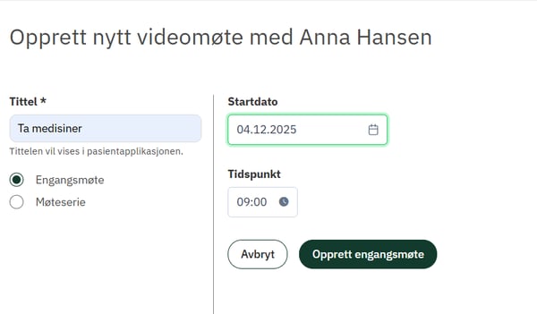 For å opprette videomøter går du til fanen Videomøter, velger type møte (engangsmøte eller møteserie), fyller inn nødvendige detaljer og lagrer.